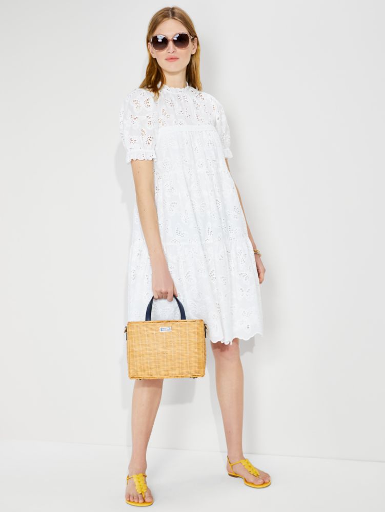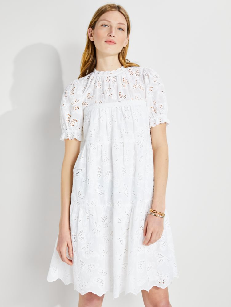 When you're feeling run-through-a-meadow romantic...this tiered dress done in white butterfly-embroidered cotton eyelet.