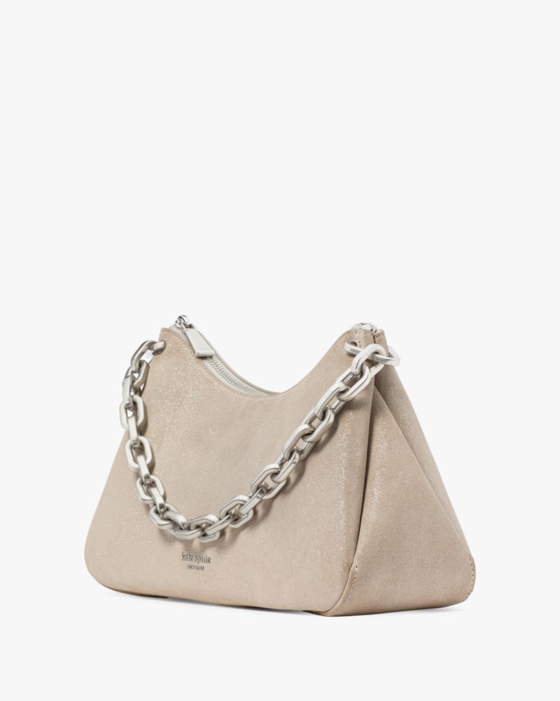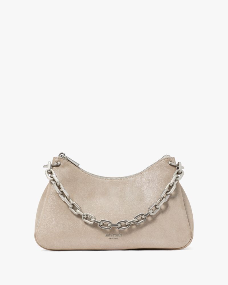 Meet Grace. Done in glitter suede, this chain shoulder bag is equal parts structured, chic and endlessly versatile.