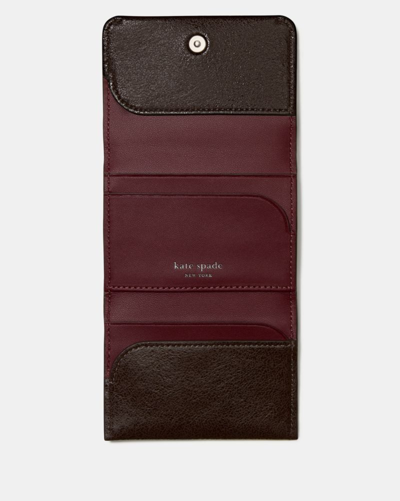 Our Halo collection is named for its unique ring-shaped hardware—an archival detail that dates back to Kate and Andy Spade's early days in business. This sleek trifold wallet in glossy glazed leather is a perfect complement.
