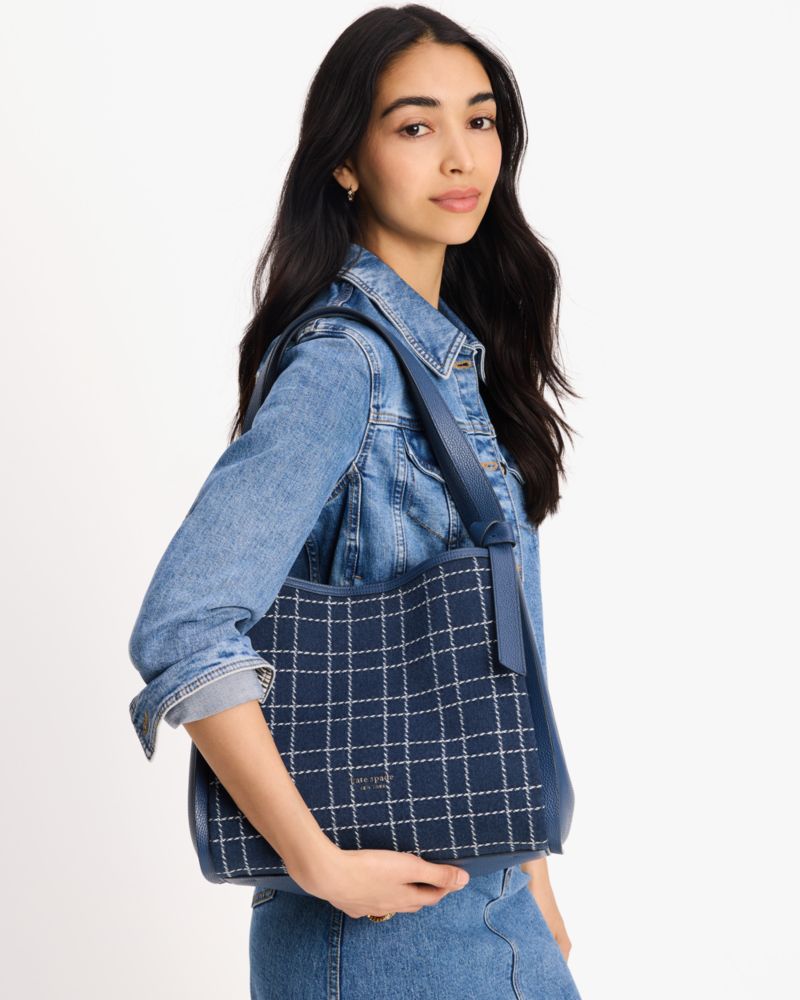 When you need a bag that ties it all together...but with a little less structure. Reach for our checked Knott shoulder bag in quilted denim for errand runs and coffee with the girls. We kept it true to the original satchel of the same name, with a cinch knotted side and plenty of pockets to organize all your (other) valuables.