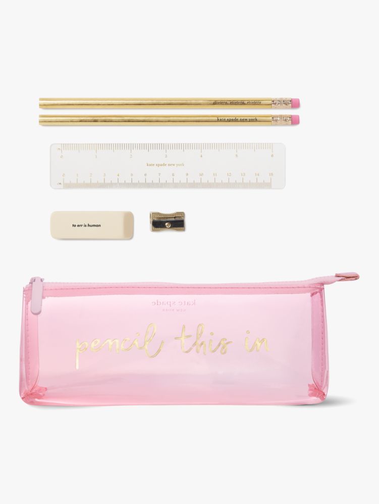 when you need to do things the old-fashioned way: this blush pink pencil case with a sharpener, eraser, ruler and two pencils will come in handy.