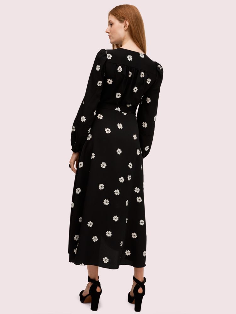 we took a classic, black crepe wrap dress and sprinkled it with our white spade clovers for a playful, signature twist. gently puffed sleeves with pretty ladder-stitched insets and a flattering self-tie waist enhance the femininty of this piece. style it with a leather or denim jacket or allow it to make a statement all on its own.