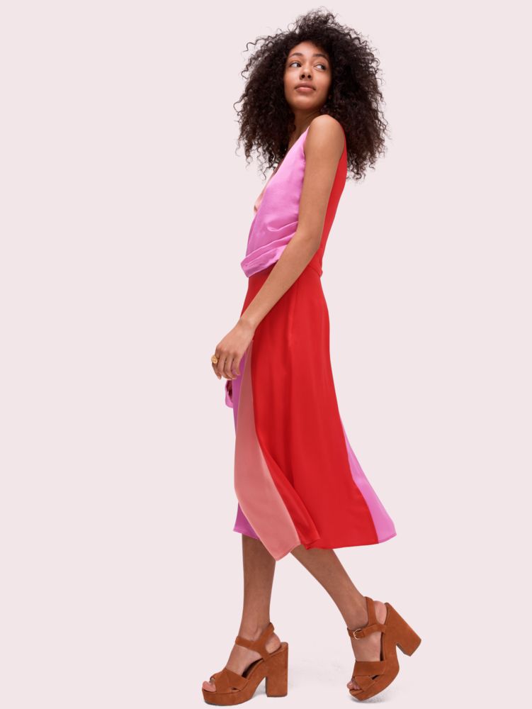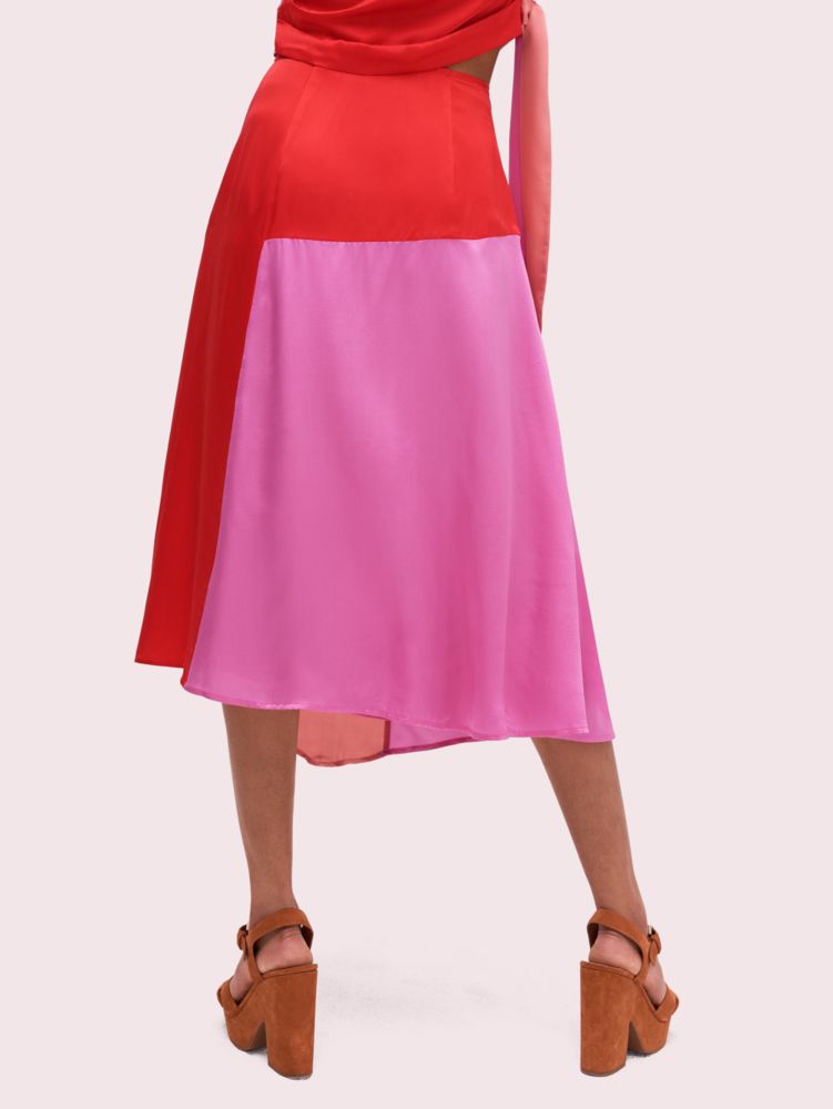 it's the little things that make this fluid silk charmeuse skirt so chic--like the intentional asymmetric seams and hem. we're also kind of obsessed with the colorblock pattern. don't the shades of pink and red look so pretty together? and it can easily be dressed up or down, so it'll look cute with a blouse and heels or paired with a graphic tee and sneakers.