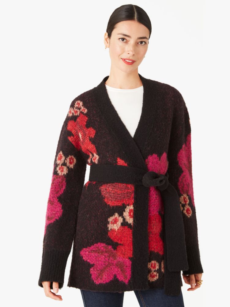 excited for sweater weather? same. when there's a slight bite in the air, we suggest cozying up in this cardigan. it's intarsia-knit from wool blend with a shawl collar, tie waist...and flowers, naturally.