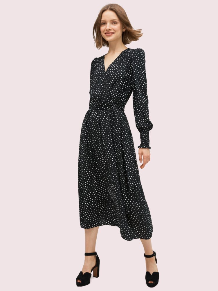 we made this dress with love. see: our tiny white heartbeat print sprinkled throughout. gently puffed shoulders and a belted waist add to the femininity of this piece. wear it with pumps and a petite top-handle bag.