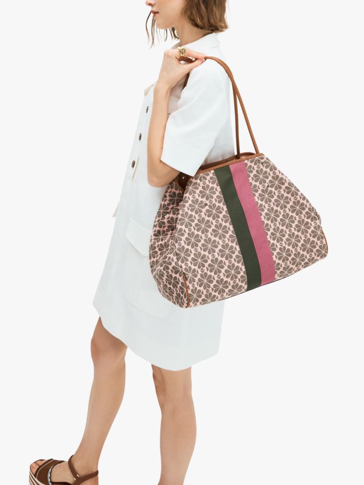 Jacquards are part of our heritage almost as much as nylon. They're unique fabrics: highly-textured with patterns that are woven instead of printed. For this collection we wanted to do something totally new with our signature spade flower pattern. We looked to Limonta, a centuries-old family-owned textile mill in northern Italy near Como. They’ve been producing and experimenting with jacquards for over 100 years and are one of the world’s most renowned mills. Here, we've used our new Spade Flower Jacquard (topped with stripes, another element reimagined from our archives) on our everything large tote--a bag that fits everything you need, even your 13-inch laptop.
