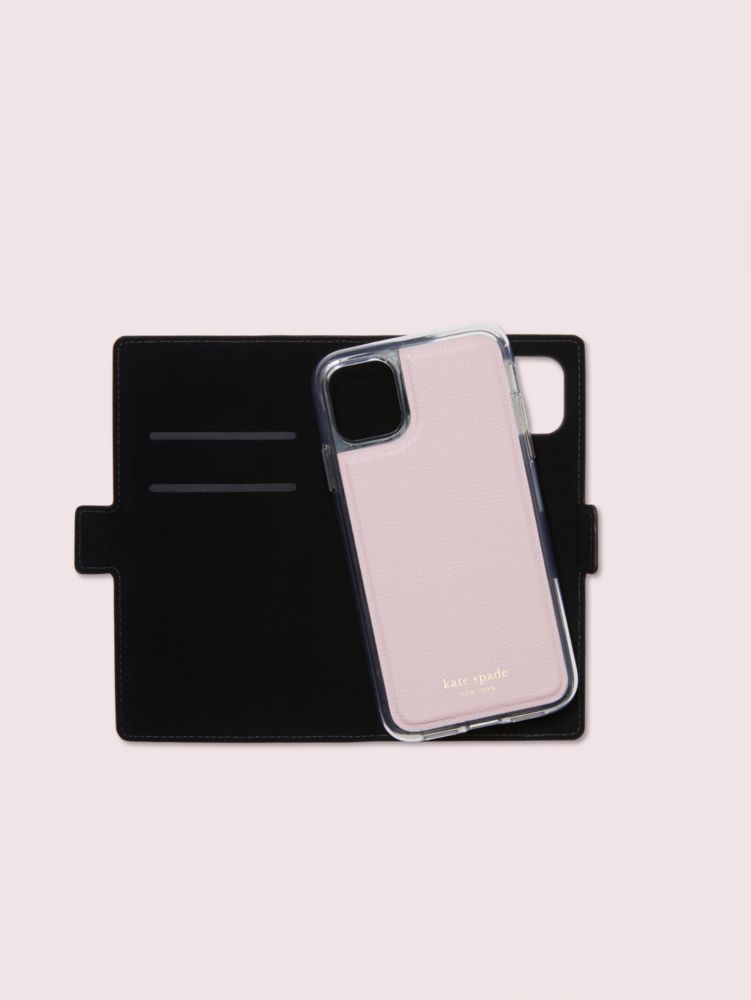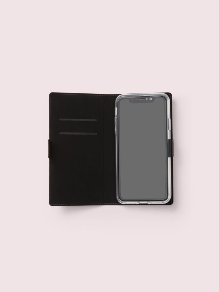 the genius thing about this folio is that it keeps your phone protected and covers the screen to prevent scratches. also, the case secures to the folio with a magnet so it's easy and fun to take on and off. we added pockets inside to carry essentials like your i.d., credit card and coffee cards. one final thought: we embellished the crossgrain leather with our stylish beaded puppy friend named francois for a playful touch.