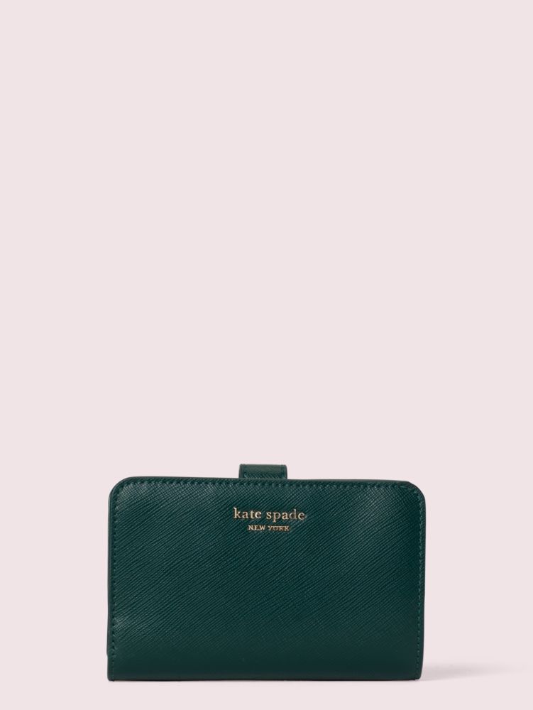 our spencer compact wallet is done in a new saffiano leather we introduced this summer. its soft texture is nice to touch and durable against drops and scratches so it'll keep its sleek, luxe look. of course, we made this wallet as functional as it is beautiful: unsnapping it reveals that the spade flower jacquard-lined interior is filled with plenty of slots, slip pockets and zipper pockets for your current and growing card and receipt collection.