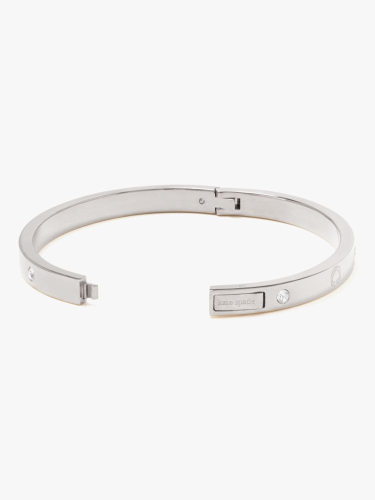 our infinite spade engraved bangle is built to last. crafted of rose gold-tone stainless steel, this stackable bracelet is extra durable and high on the shine scale. we topped it with our signature mark and sparkly faceted crystals.