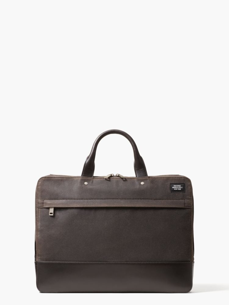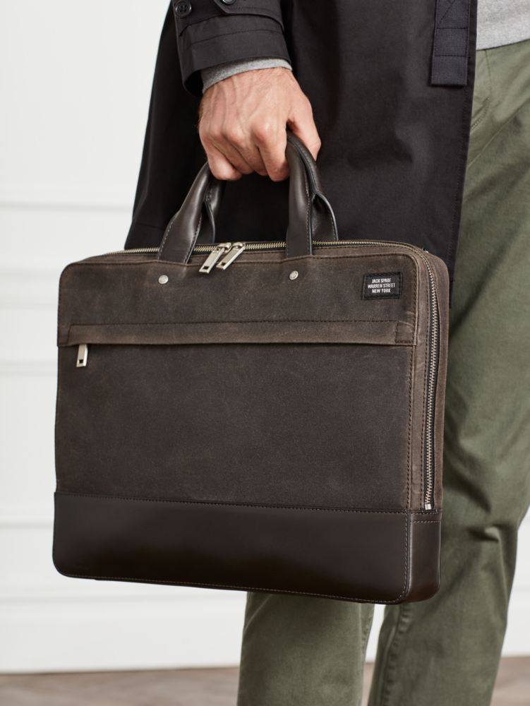 We cut this Jack Spade bag in a water-resistant waxed cotton that develops a unique patina with age from Scotland's Halley Stevensons Mill (est. 1864). It's filled with handy details like a detachable shoulder strap, plenty of exterior and interior pockets, and a secure neoprene sleeve for your 15-inch laptop. Minimalist commuters and laptop warriors, this is your brief.