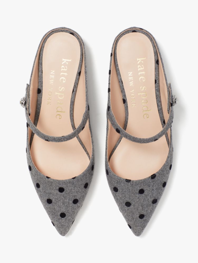 your choice of shoes says it all. when you slip on our meg mules, made from velvet-dotted felt in a glamorous, slip-on style and accented with sparkling gems, they'll all be wondering: who's that girl?