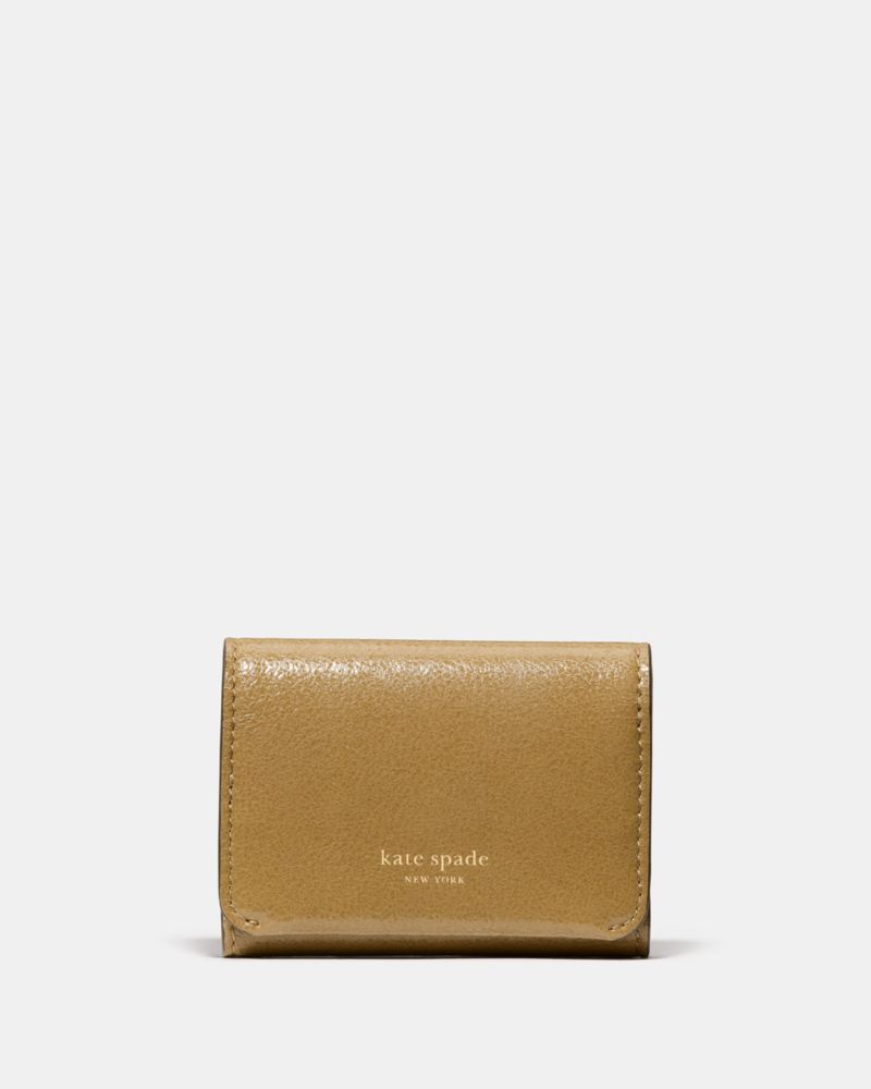 Our Halo collection is named for its unique ring-shaped hardware—an archival detail that dates back to Kate and Andy Spade's early days in business. This sleek trifold wallet in glossy glazed leather is a perfect complement.