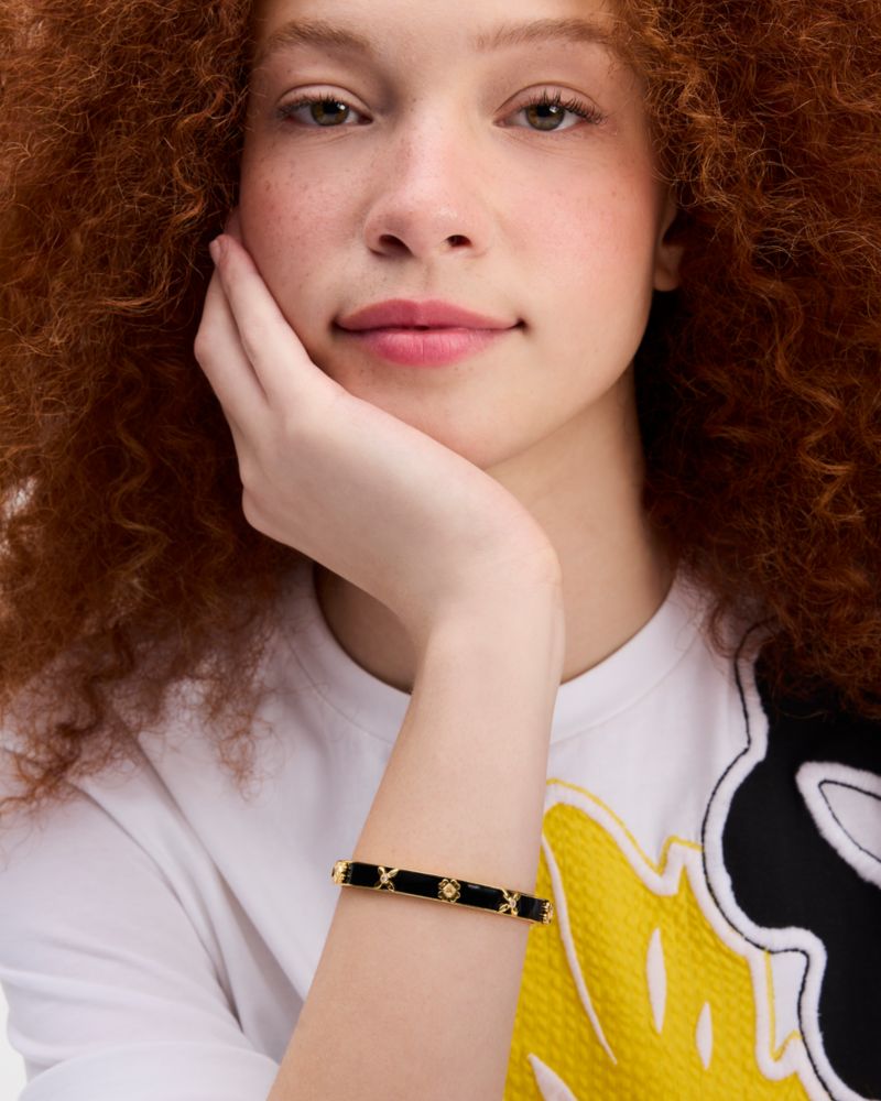 Kate Spade,Heritage Bloom Hinged Bangle,Enamel,Floral Embellishment,Logo,Rhinestones,Gold Metal,Day Party,