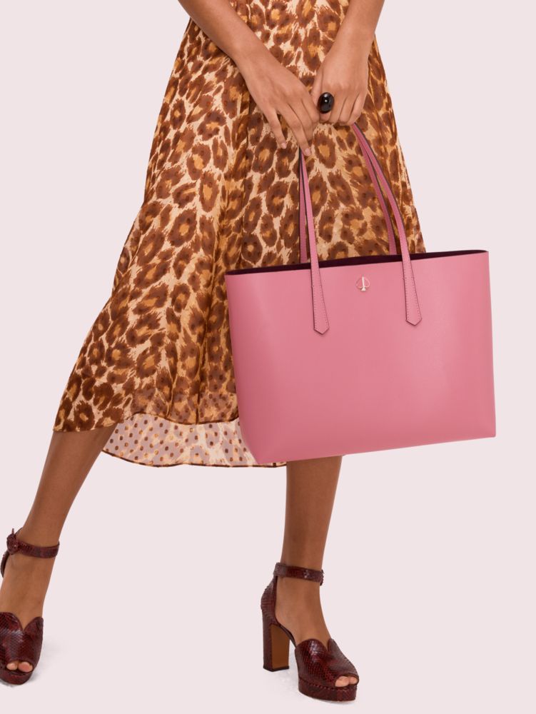 the molly large tote is our answer to the effortless everyday bag. crafted from crossgrain leather, it's structured with a hint of slouch and extremely lightweight so you can carry all your essentials. a removable pouch snaps in and out for even more storage space. and a dog-clip closure keeps the tote closed while giving you easy access to what's inside. finished with our iconic enamel spade and a gold foil emboss logo.