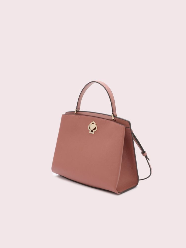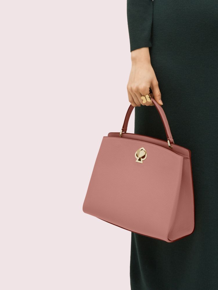 our romy medium satchel is crafted of both pebbled and smooth italian leather for an unexpected mix of textures. inside, you'll find a buttery-soft faux microsuede lining and a large slip pocket spacious enough to hold a small wallet. an optional and adjustable strap allows you to sling it over your shoulder when you need a free hand for iced coffee. and don't worry about setting it down--the tiny feet will keep it beautiful for years to come. our spade heart twistlock doubles as clever décor and a very pretty closure.