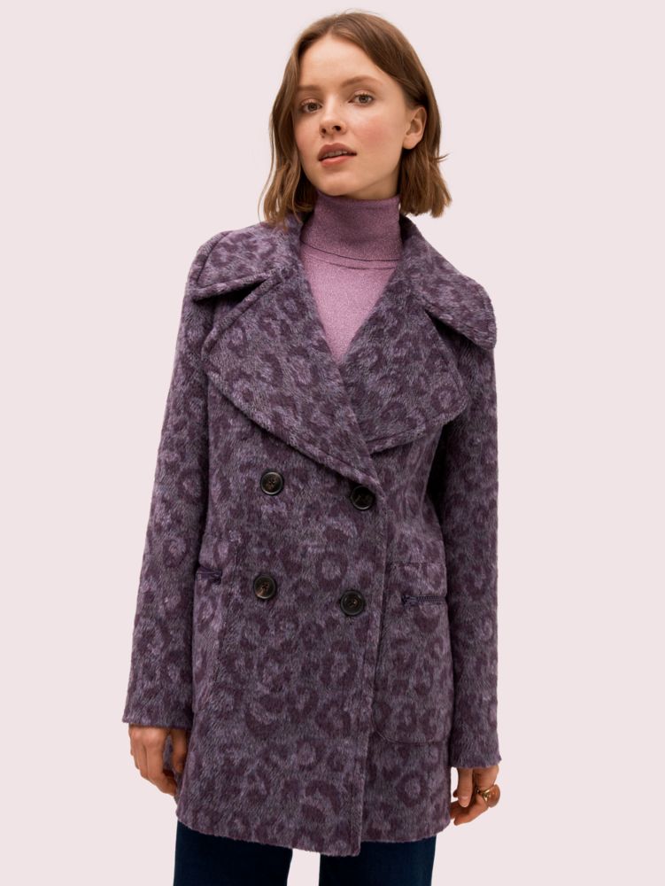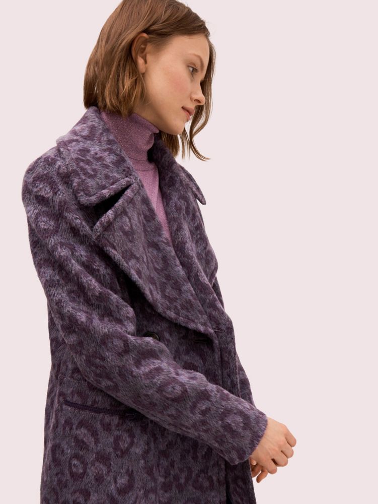 here's a classic peacoat with a playful twist. we designed it using an ultra-soft brushed knit printed with leopard spots for fall. (don't be surprised if you find yourself constantly petting it.) then, we finished it with drop shoulders for a relaxed look and oversized buttons with an eye-catching iridescent finish. the silky satin lining makes it feel just as cozy on the inside as it does out. we love it so much, we sent it down the runway in multiple colors at our fall 2019 show.