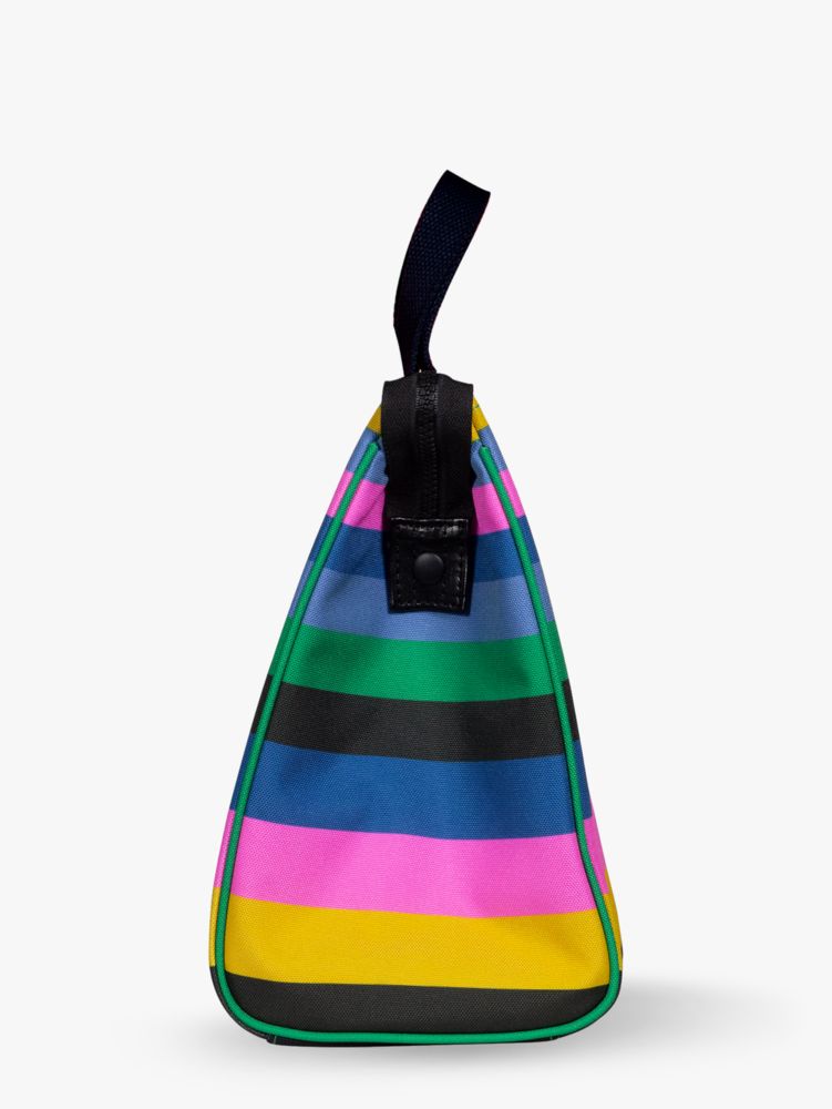 make lunchtime even more enjoyable with this pretty lunch tote. decorated with bold multicolored stripes, it's kind of like a handbag for your food.