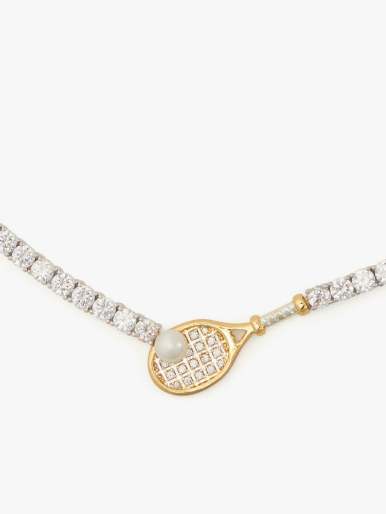 No doubt about it. In this glamorous tennis necklace styled with a golden racquet and some impressive shine, you are most definitely queen of the court.