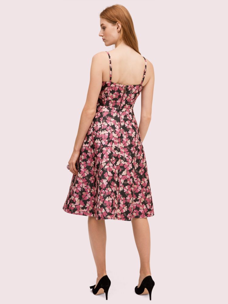 in our world, flowers are always in bloom. see: the graphic pink jacquard blossoms on this black sleevless fit-and-flare dress. look closely and you'll find we wove it with metallic thread throughout. we finished it with a sweetheart neck and slender spaghetti straps to up the femininity.