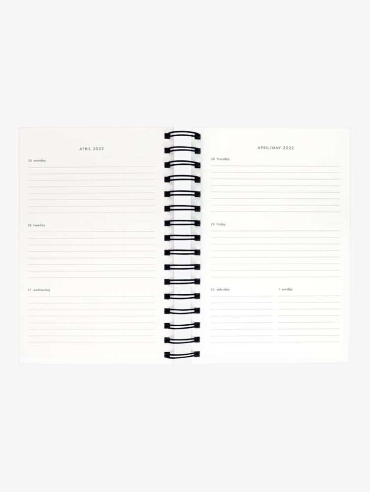 - includes: gold foil sticker sheet, laminated tabs, monthly & weekly spreads, holidays & celebrations, notes pages, interior pocket, elastic closure
