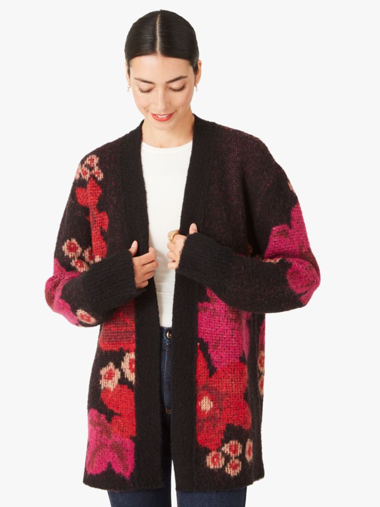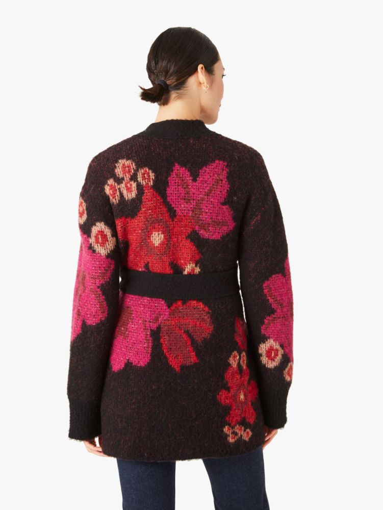 excited for sweater weather? same. when there's a slight bite in the air, we suggest cozying up in this cardigan. it's intarsia-knit from wool blend with a shawl collar, tie waist...and flowers, naturally.