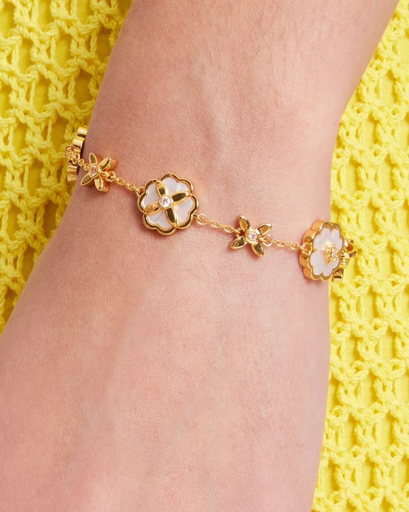 We reimagined our signature spades as an elegant floral motif. Here, we used it to adorn this pretty bracelet with mother-of-pearl accents.