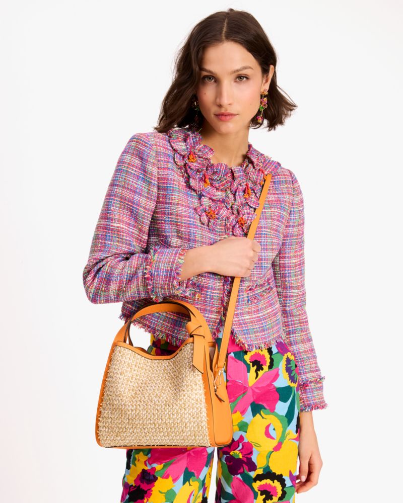 Kate Spade,Knott Raffia Tweed Medium Crossbody Tote,Raffia,Canvas,Leather,Crossbody,Straw,Knot,Adjustable,Gold Metal,Day P...,Multi Color