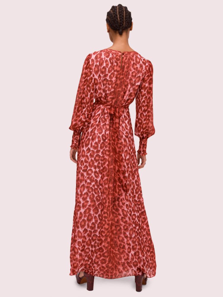 as seen on our fall 2019 runway. you might recognize our panthera a-line midi dress by its fierce pink leopard print and tonal polka dots woven throughout the silk chiffon. a scoopneck, gathered skirt and ruffled cuffs are subtle details that add to the easy femininity of this piece. pair it with boots or peep-toe pumps and your favorite crossbody.