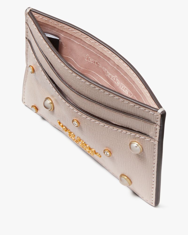 Neatly stash your cards in our Purl cardholder, crafted in scratch-resistant Saffiano leather and dotted with faux pearl beads.