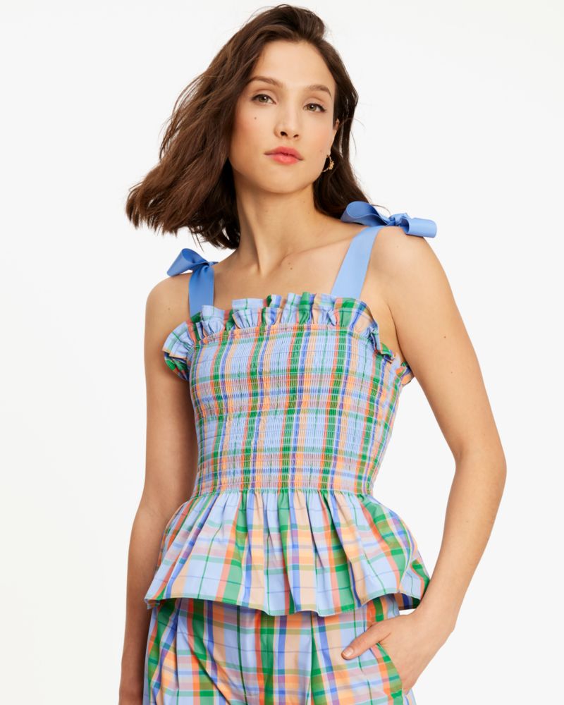 Add a fun pop of color to your springtime wardrobe. This smocked top is done in our Sunshine Madras print taffeta and finished with pretty shoulder ties.