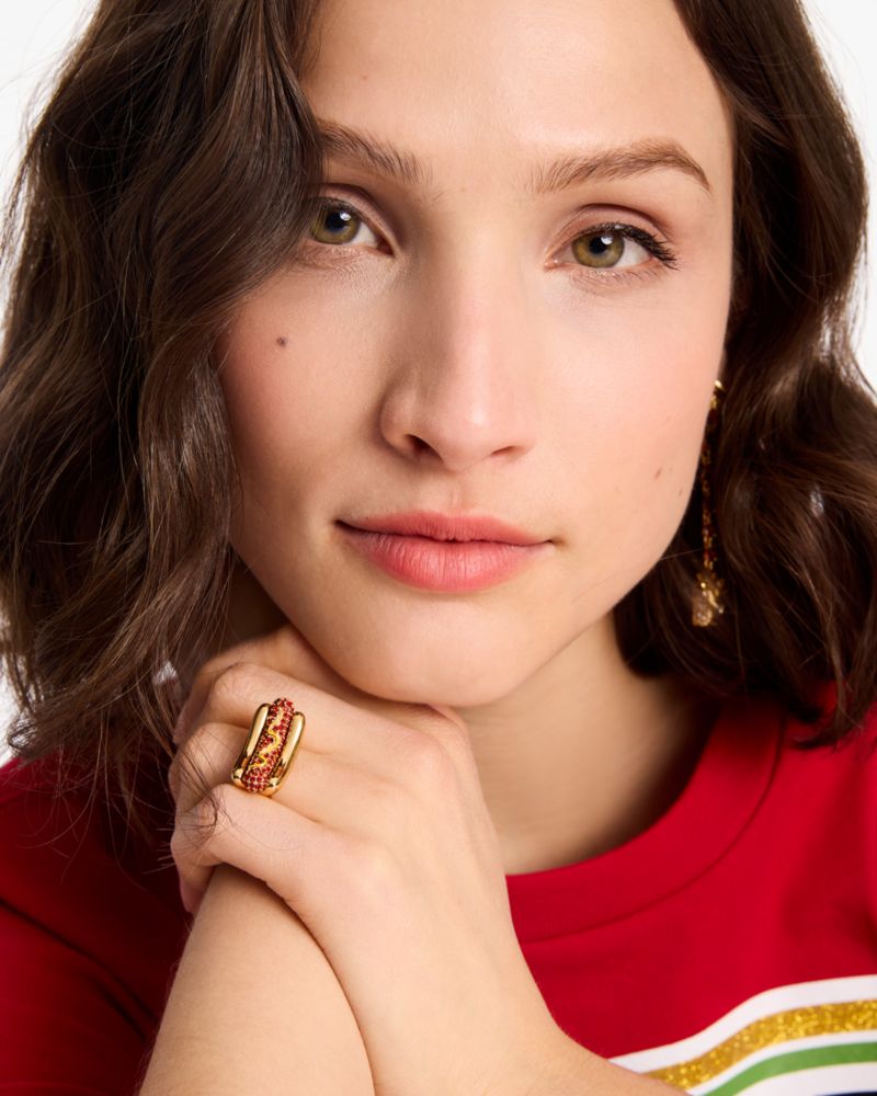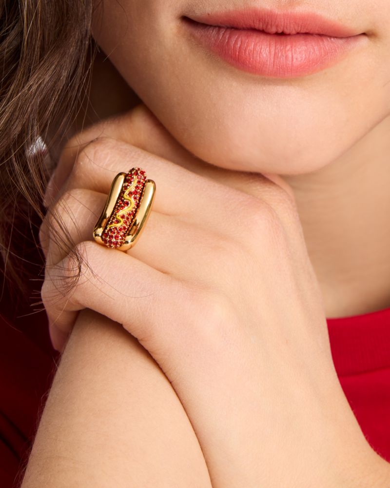 Topped with a crystal-embellished hot dog, this cocktail ring is the chicest way to get your snack fix.